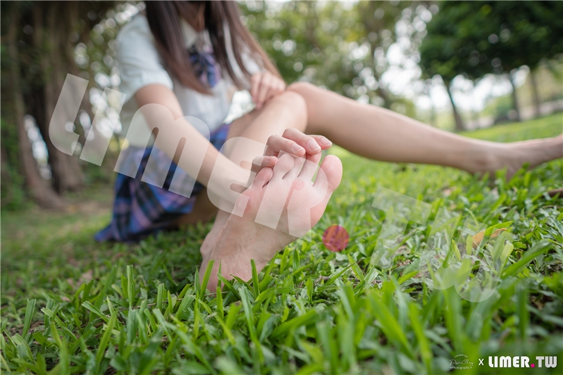 她今天穿上JK格裙,赤腳踩在草地上玩,
